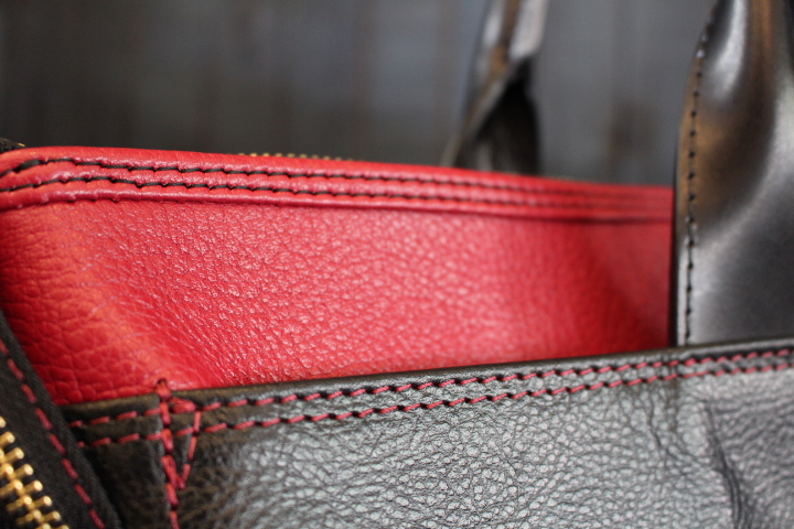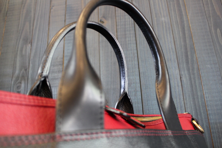 持ち手はヌメ革を使用している為カチっとしていて、鞄の荷物が多い方でも握やすくなっております。