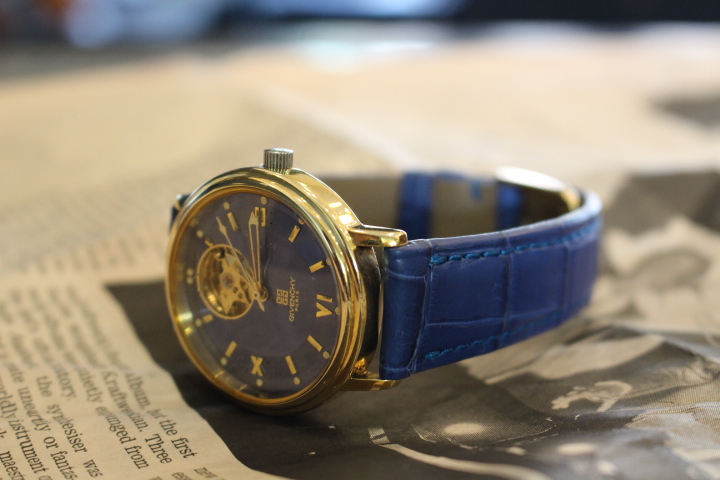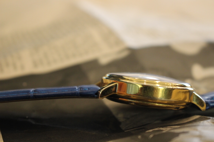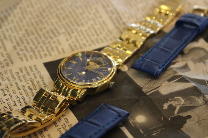 ゴールドのイメージがとても強いこちらの時計ですが、時計ベルト1つで大きく印象を替える事が出来ます。