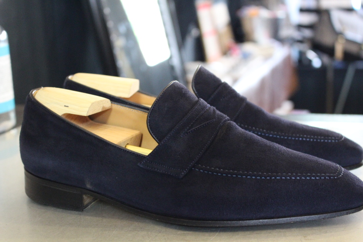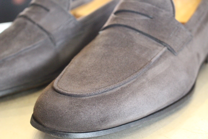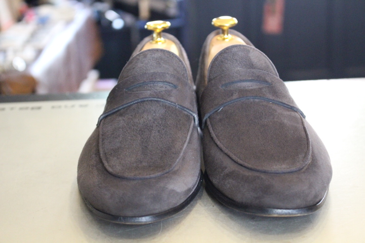 写真では分かりずらいですが、グレー色のスエードローファーは磨きの依頼で御来店。