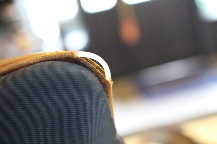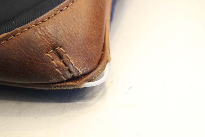 破れた部分を1度解き、近い色の革を当てて縫い直します。