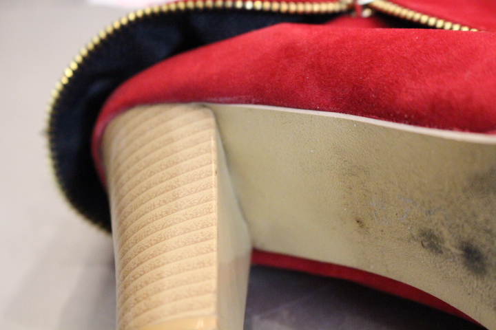 応急処置で接着剤で止めるも、全体重がこのヒール部分にかかる為恐らくすぐに外れてしまう事でしょう・・・