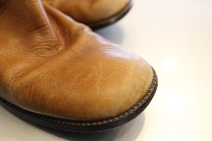 革が乾燥しており、特につま先の色抜けが目立ちます。