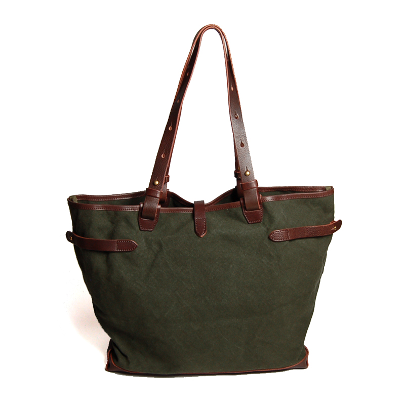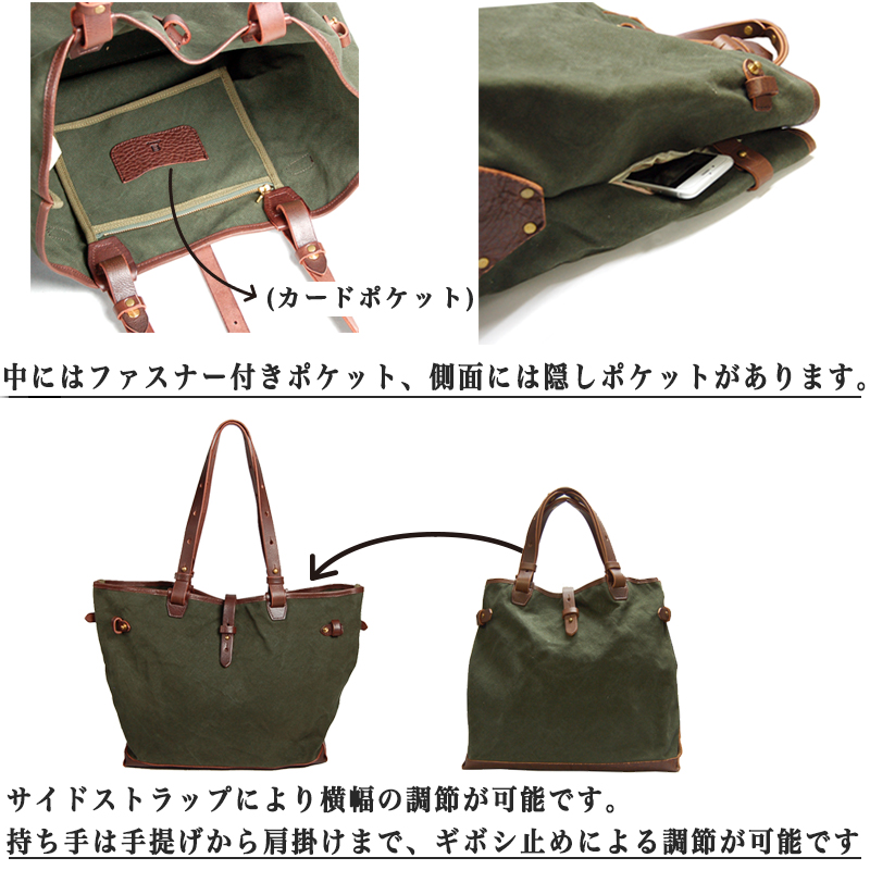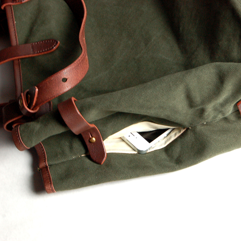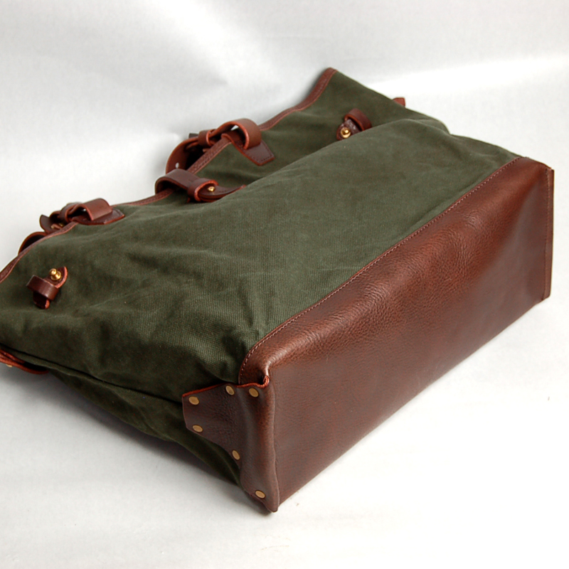「ギミックが効いていて、かつ質実剛健」をテーマにデザインされたこのバッグは、本体の素材には防水性と強度を併せ持つパラフィン加工のキャンバス素材を、持ち手や底面にはオイルレザーを使用しています。