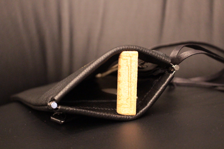二層構造になっており、前面に携帯やカード、背面に鍵や小物を収納できるようになっています。
