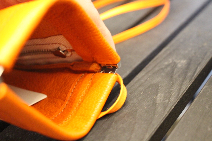 二層構造になっており、前面に携帯やカード、背面に鍵や小物を収納できるようになっています。
