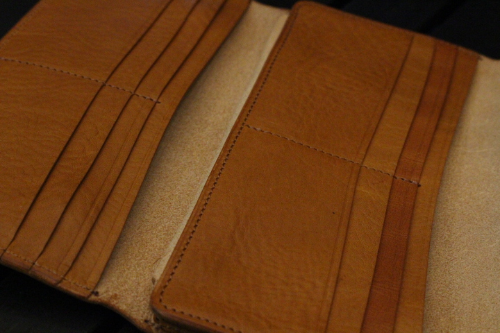 上のフラップ(ふた)を開けるとたっぷり入る札入れ、2つ目のフラップを外すとカードが12枚と札が入るポケットが2箇所あります。