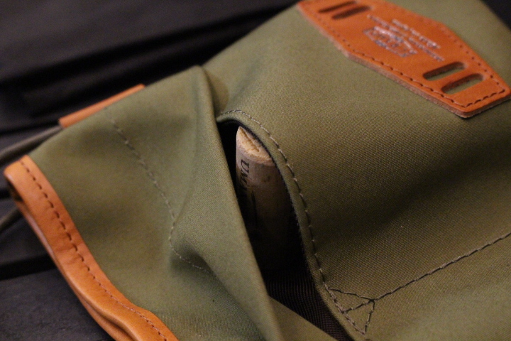 簡易的な作りながら表にはマチ付きのポケットが2つ配されており、小物の仕分けも可能です。タバコ、携帯、財布+aといった手周り品がすっぽり入り、持ち運びが楽なちょうど良いサイズです。