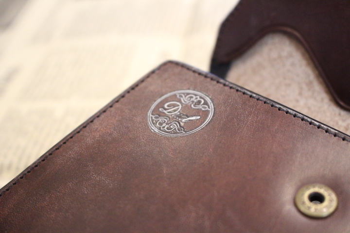 長財布と同デザインのエンボスラインやアラベスク柄の施されたコインポケットの スライダー、フラップ開閉時に覗くブランドロゴやタンナーの箔押しロゴが、華美に なりすぎないデザイン上のアクセントになっています。