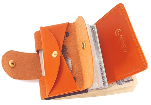 三つ折り構造のこちらのお財布、使い方が少し特殊です。小銭とカードを使うときは縦持ちで。