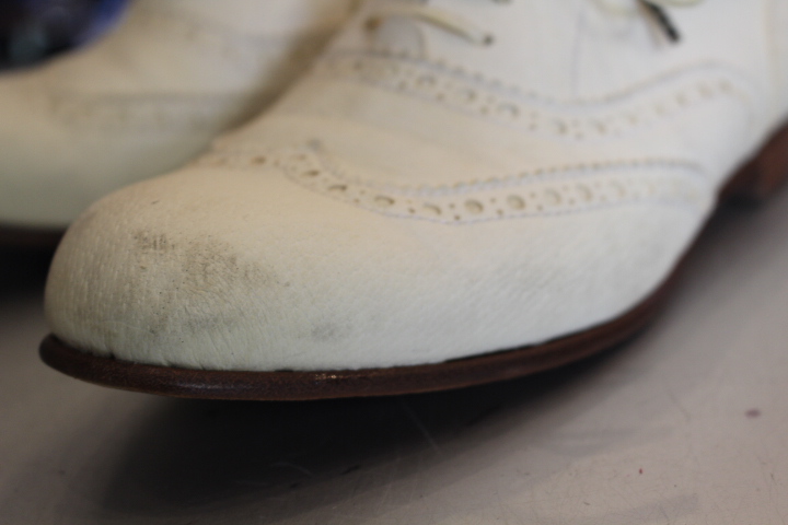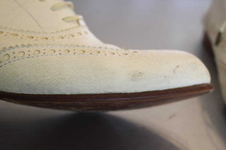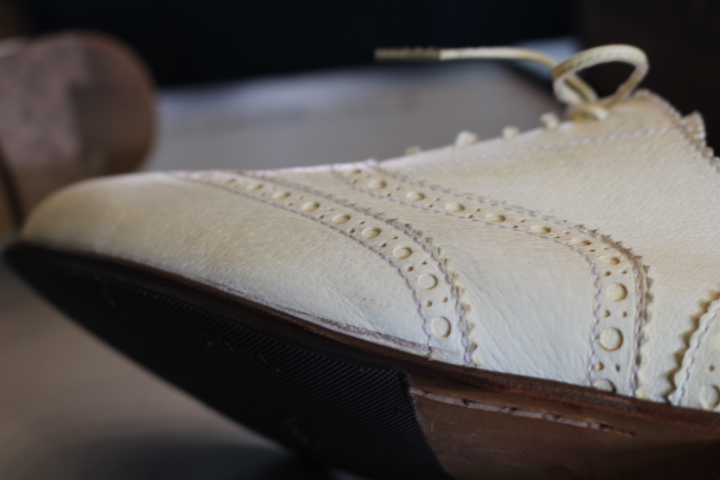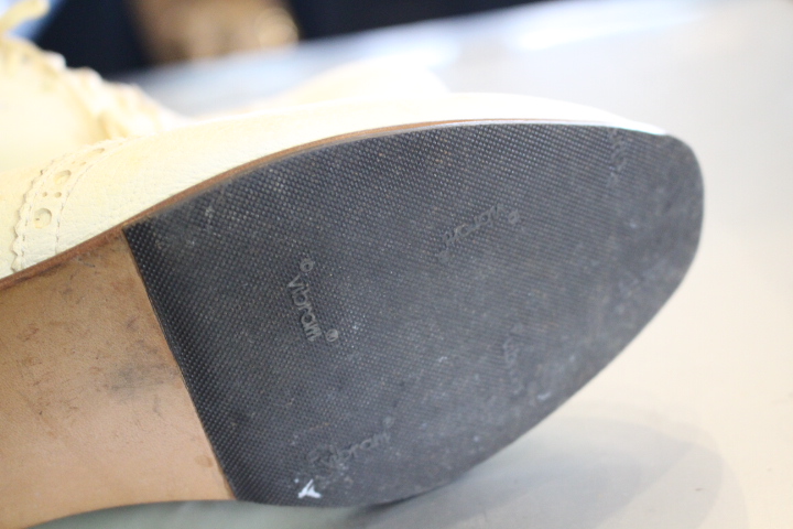 お洒落なベージュのブローグシューズは接着の剥がれで御来店。