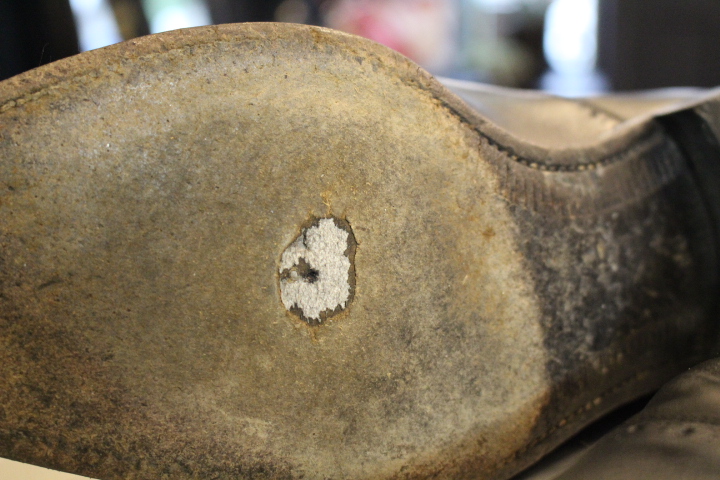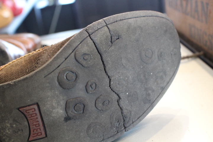 カカト減り過ぎや出し縫いのステッチが切れてソールが剥がれかけの靴。