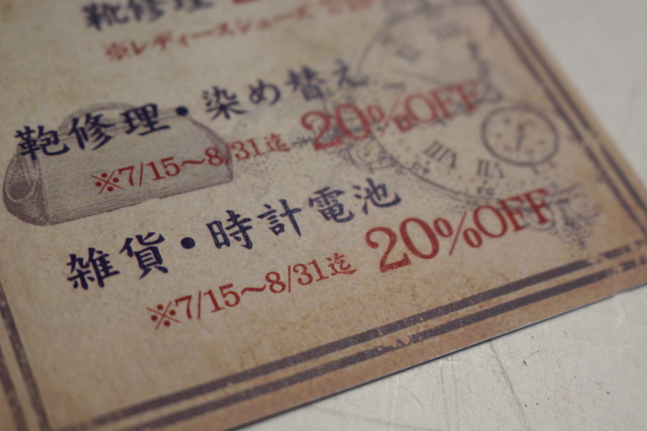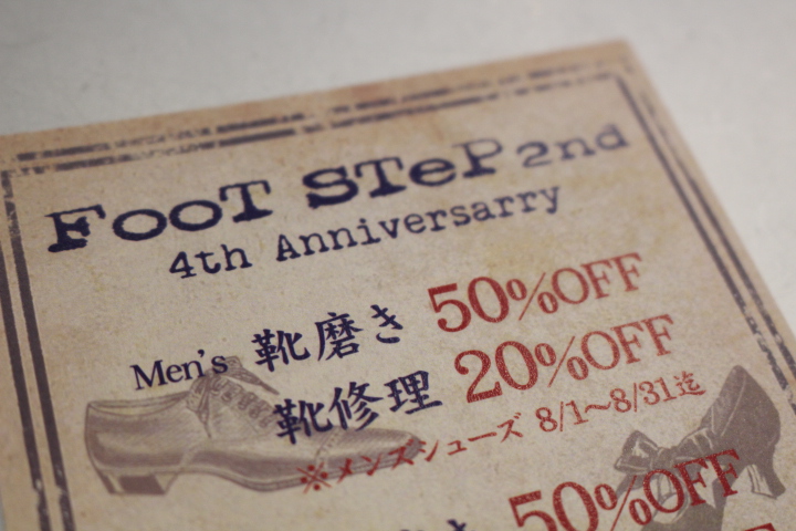最後に、4周年のDMが届いた方は、このハガキをお持ち頂ければメンズシューズの靴磨きが50%OFF&修理が20%OFFです。