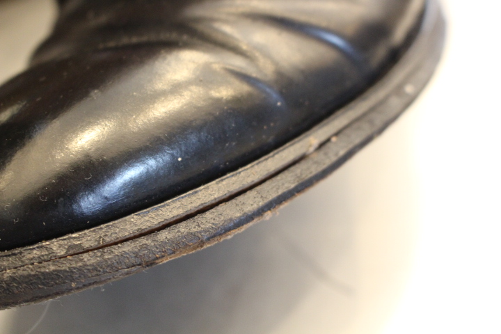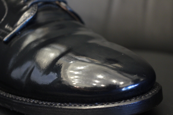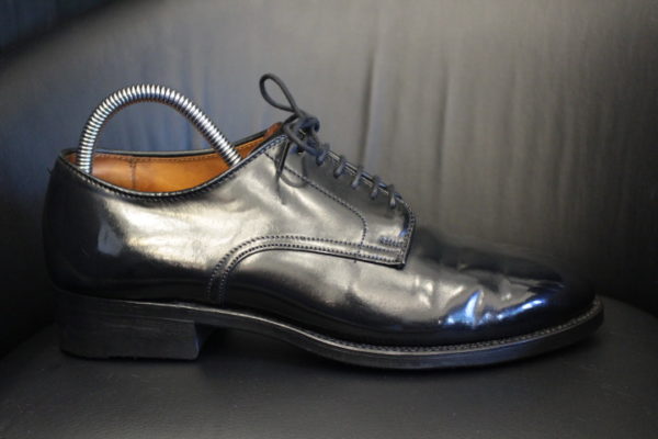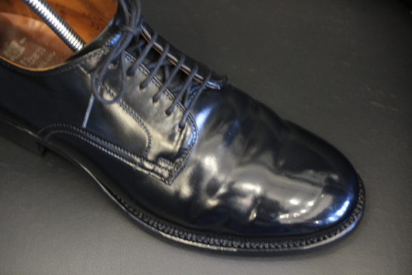 アッパーのコードバンも乾燥しきって履き皺が形状記憶されておりますが、しっかりと磨く事でダイヤモンドの輝きを