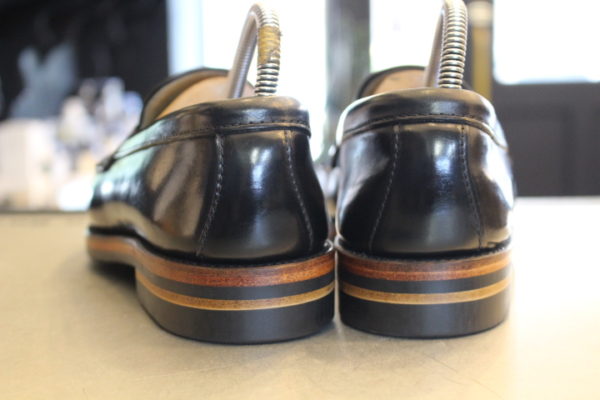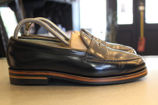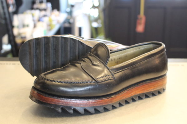 カスタムされたオールデン987のローファーですが、今回は日常使いしやすくソールを薄くしてオールソール致します。