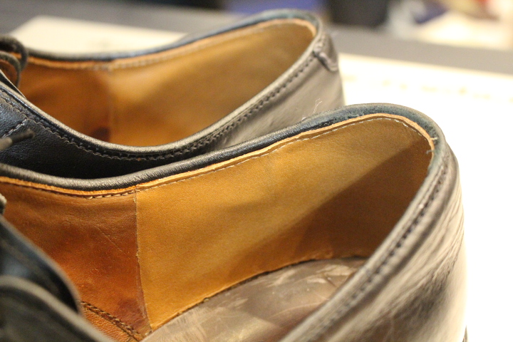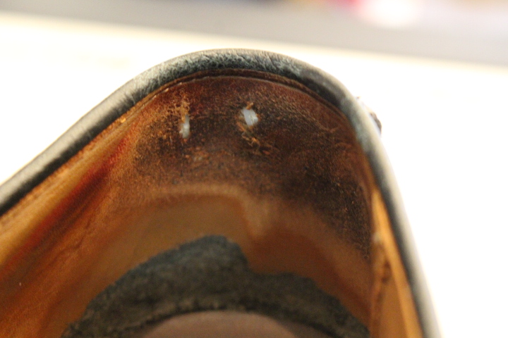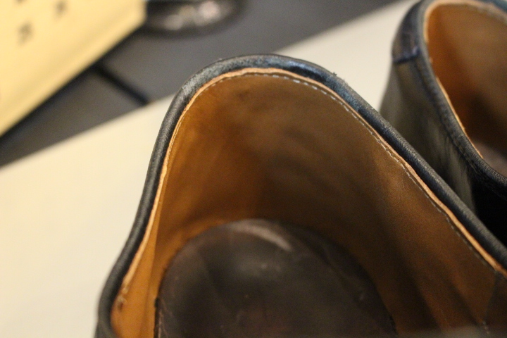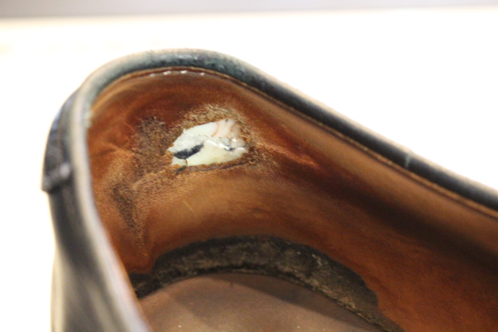 破れていたライニングは新しく革を当てて元の針穴通りに縫う事で、アッパーにダメージを与える事無く補強する事が可能。