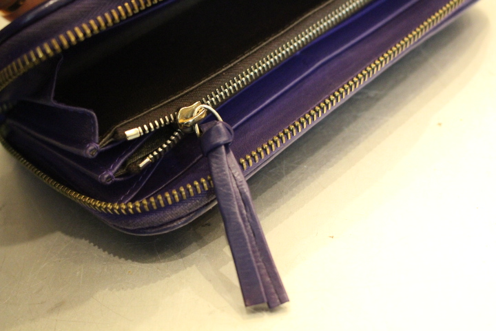 近い色の革で作り替える事も出来ますが、今回はお財布全体も染め直す為、つまみも近い色の革を全体に合わせて染めて作り替えました。