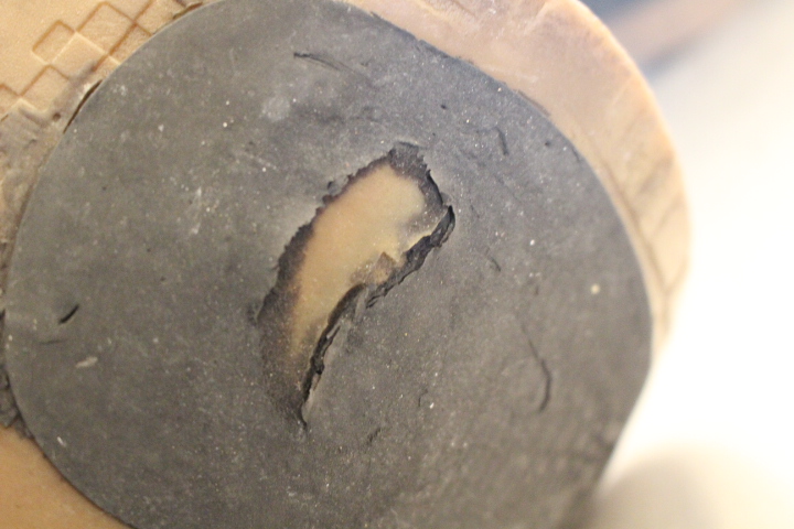 補強で取り付けられた黒いラバー素材に穴が開いている状態でした。
