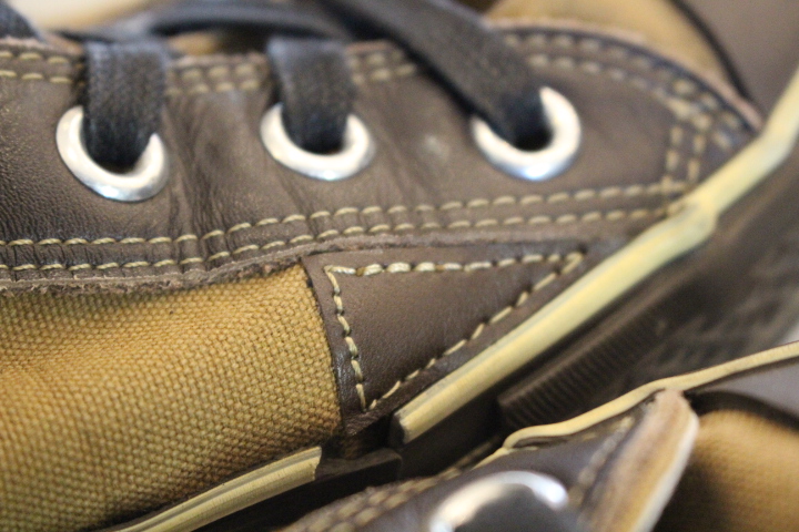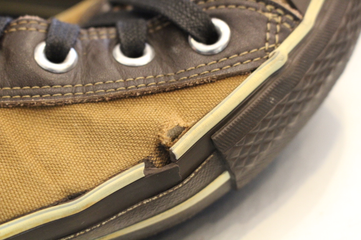 キャンバスの破れはアッパーの濃茶に合わせて修理致しました。
