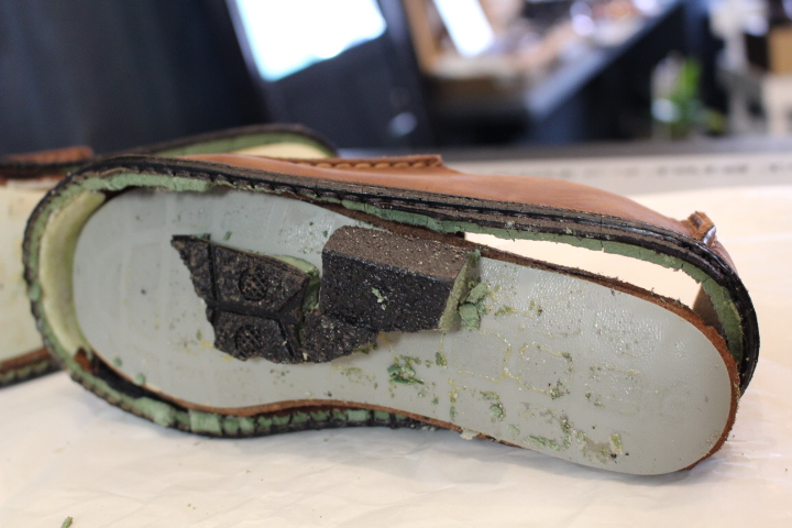お持ち頂いた時がこの状態だった為、初めの形状が分かりませんがオールソールする事に!