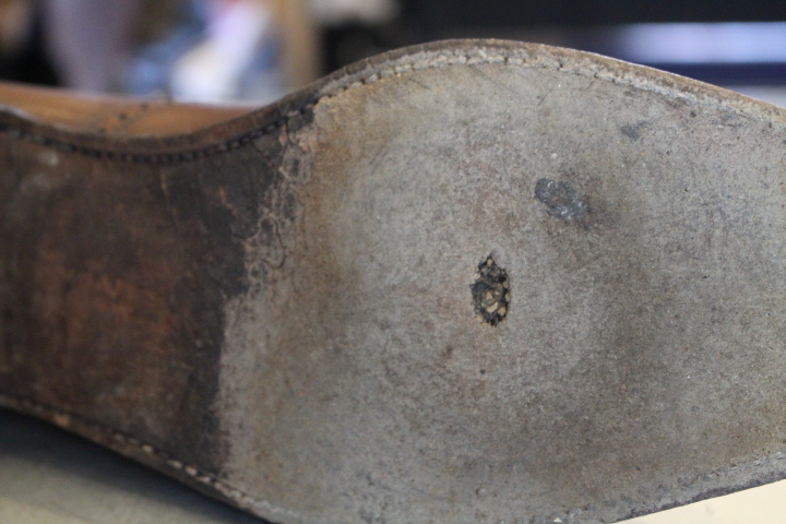 今回も前回と同様にレザーソールが擦り減り穴が開いております。