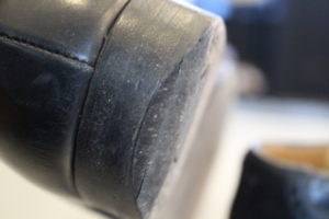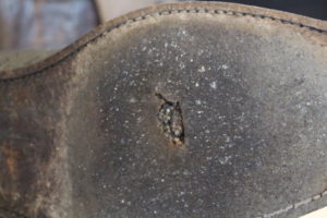 トップリフトの交換時期がソールに穴が開くタイミングに近い為、もう少し早い段階で部分的な修理を行うかそのまま履き続けてオールソール(靴底交換)を行うかの判断のタイミング。