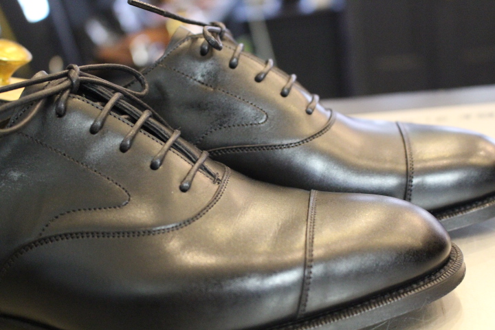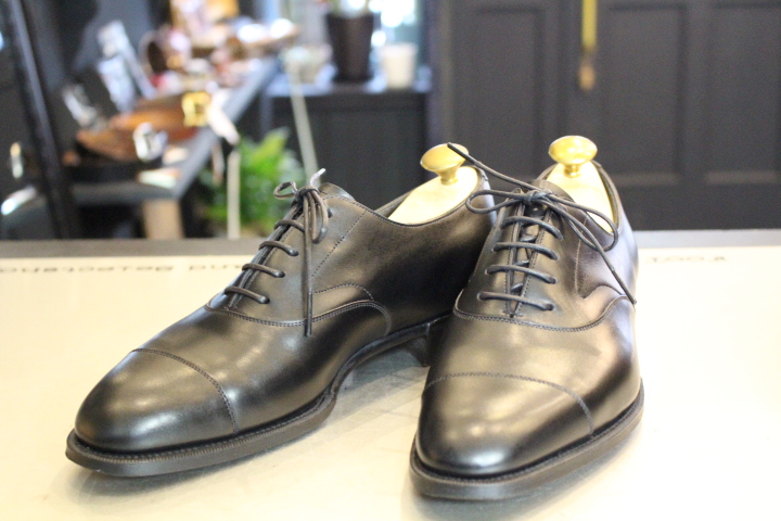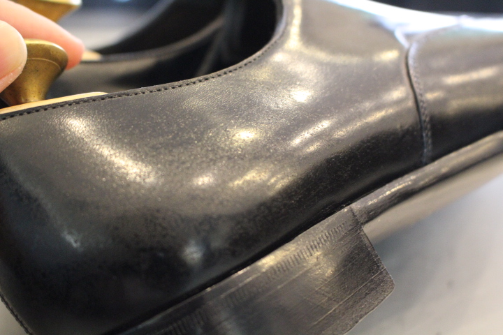 こちらのエドワードグリーンは友人に頂いたそうですが、艶々した質感がお好みではないそうなので全てのWAXを除去し、自然な感じに仕上げます。
