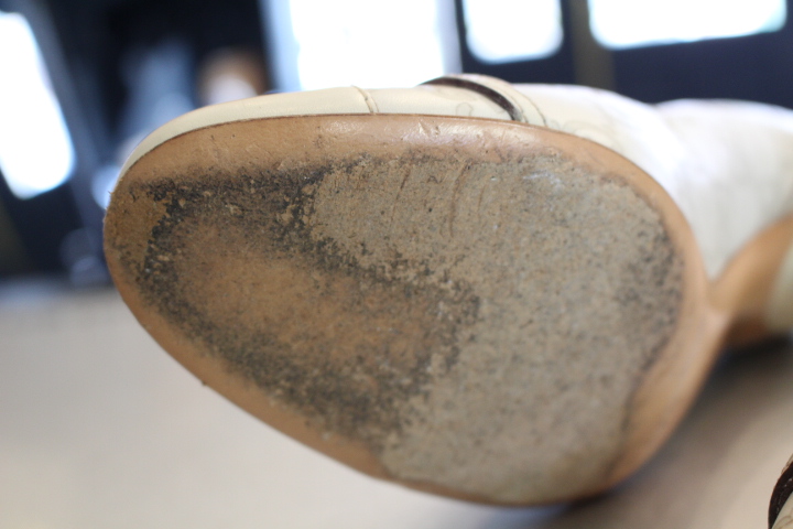 購入後少し履かれた様子で、ソールの仕上げが剥がれている所がよく擦れる部分。