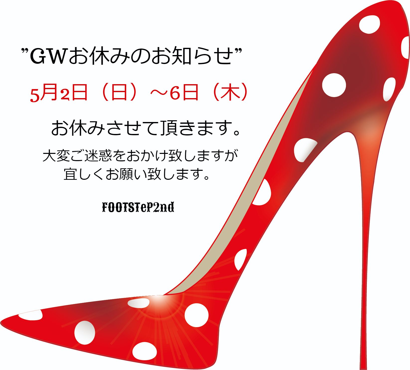 『GWのお休みのお知らせ』5月2日(日)~6日(木)迄お休みさせて頂きます。大変ご迷惑をおかけ致しますが宜しくお願い致します。~FOOTSTeP2nd~北九州・小倉/靴・鞄の修理屋FOOT STeP 2nd BLOG 0 Facebook