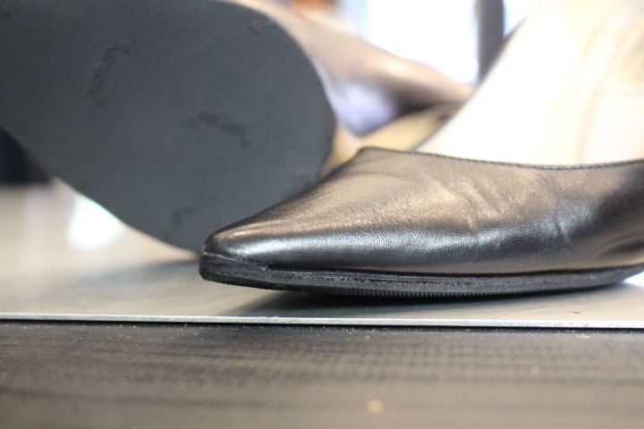 お持ちのパンプスのつま先が写真の様に減っている方は早急にハーフラバーソールの取付をオススメ!