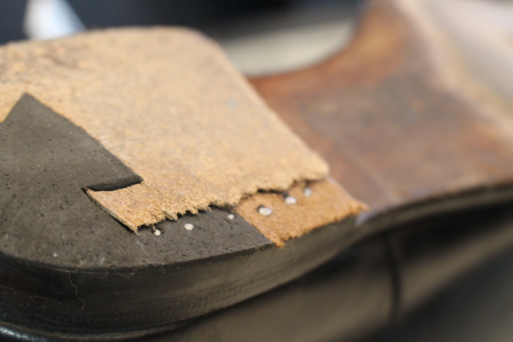 レザーソールが薄くなると写真の様に穴が開いてしまいます。