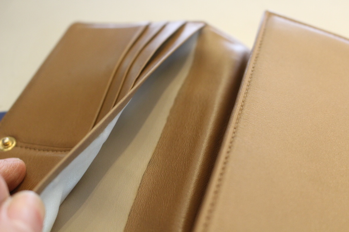 今回はお財布の内側迄染めておりますので、札入れの部分の被さっている部分が元の色になります。