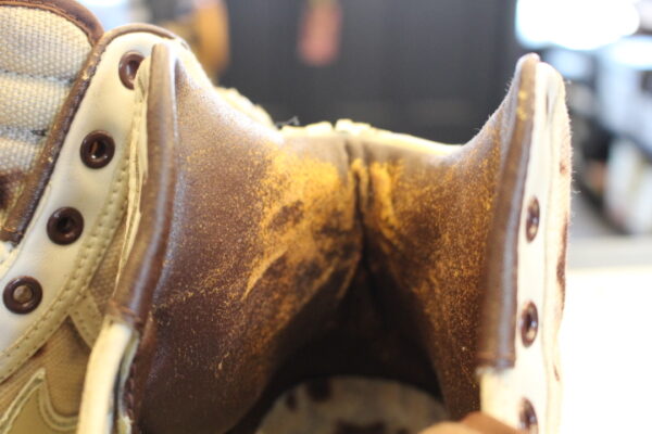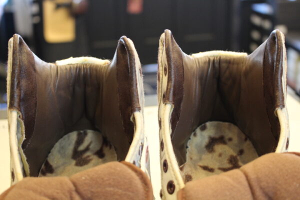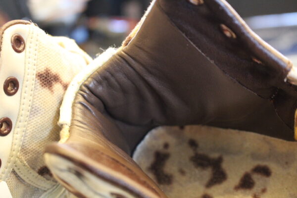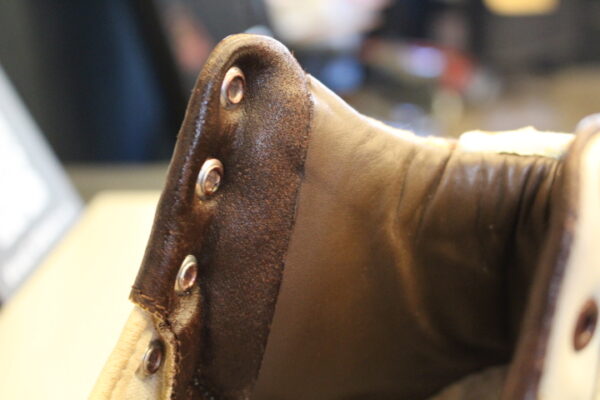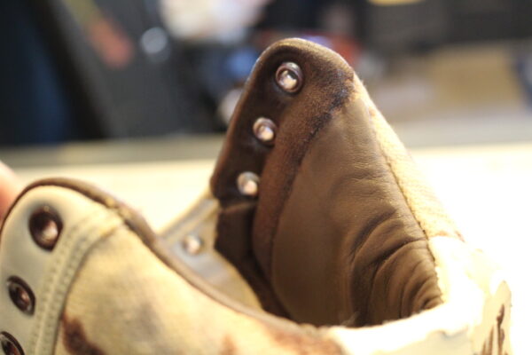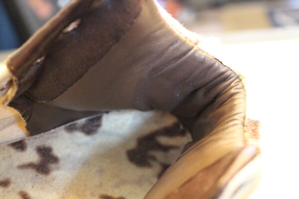 白い靴下を履くと茶色い破片が付き、靴を脱ぐ剥がれの状態がどんどん目立つ為、カウンターライニングの修理を行います。