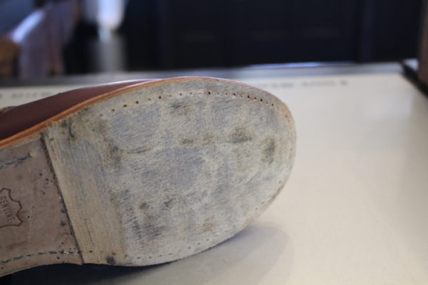 ソールと縫っている出し縫いのステッチを抜き、ミッドソールに付いている古いソールを綺麗にします。