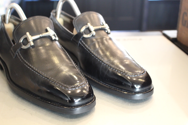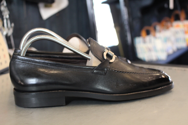 例えばこちらのフェラガモのローファーはレザーソールのまま履かれてり、写真のソール中央部分は穴が開く寸前です。