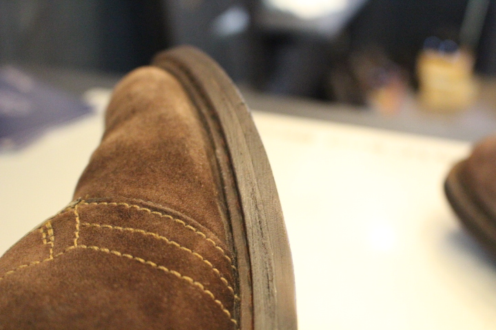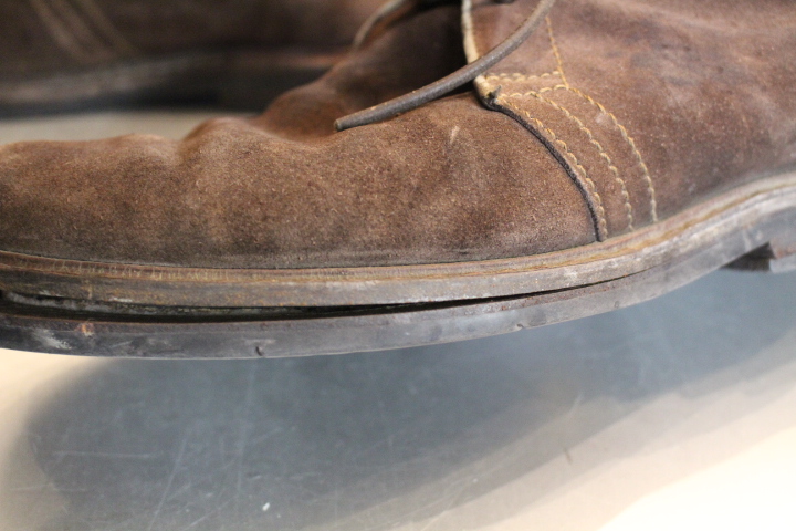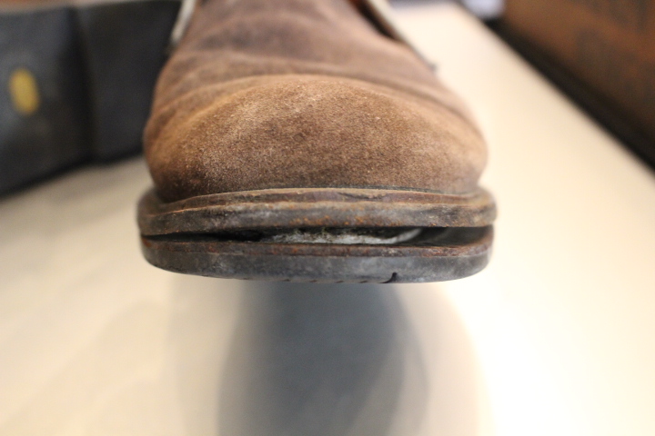 今回はソールを全て取り外し、古い接着座を取り除き再度接着、ずれたソールを軽く削って仕上げました。