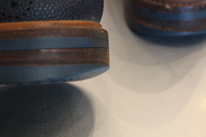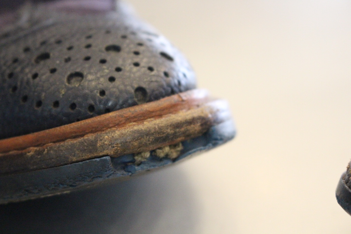 今回の修理方法は、つま先の減り具合とソールカラーの兼ね合いで、オールソール(靴底交換)を行いました。