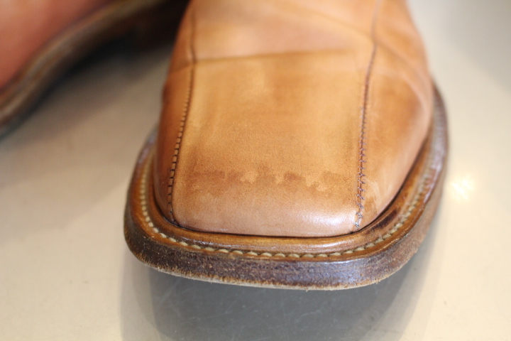 つま先に出来たシミはサドルソープで洗う事で目立たなくなりました。