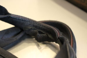 乾燥と擦れの繰り返しで革は薄くなり破れている状態です。