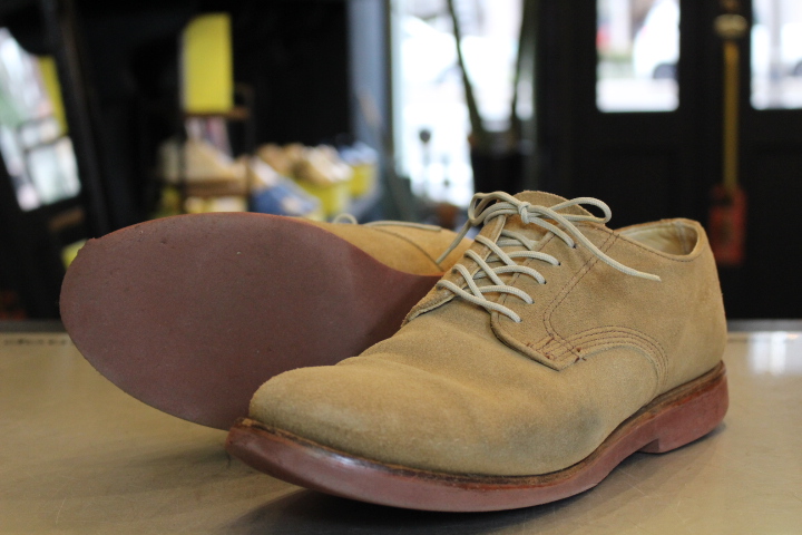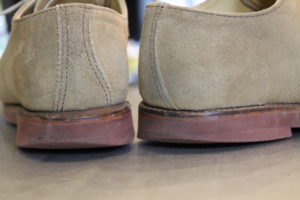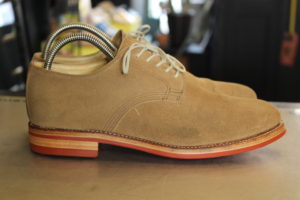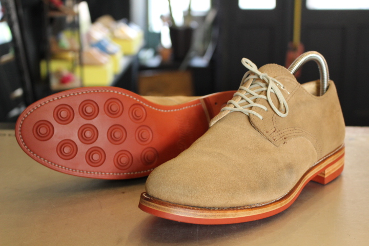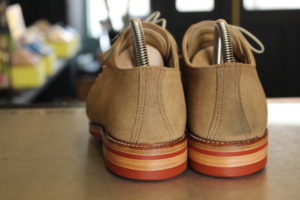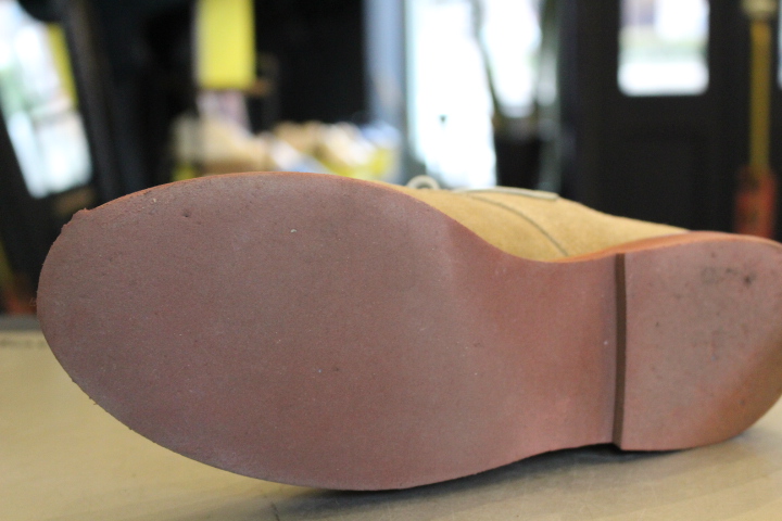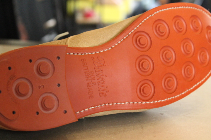 全体のイメージが崩れない様に、今回はダイナイトソールのレンガ色でオールソール(靴底交換)致しました。