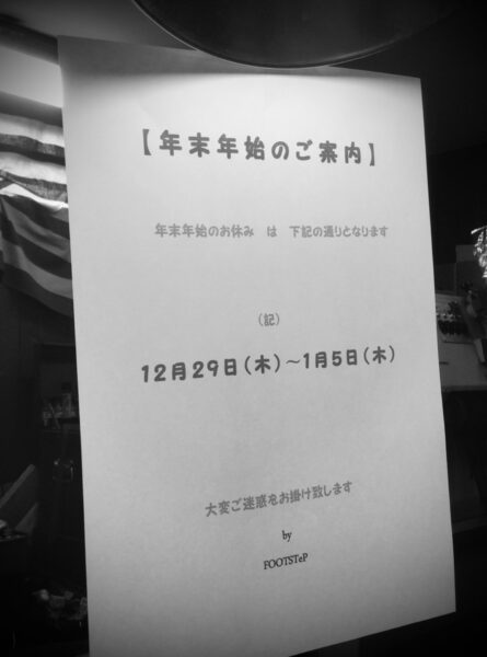 footstep+ footstep2nd12/29~1/5 お休み となります大変ご迷惑をおかけし致します尚新年1/6 10時 より営業スタートさせて頂きますでは、mata!FOOTSTeP BLOG 0 Facebook