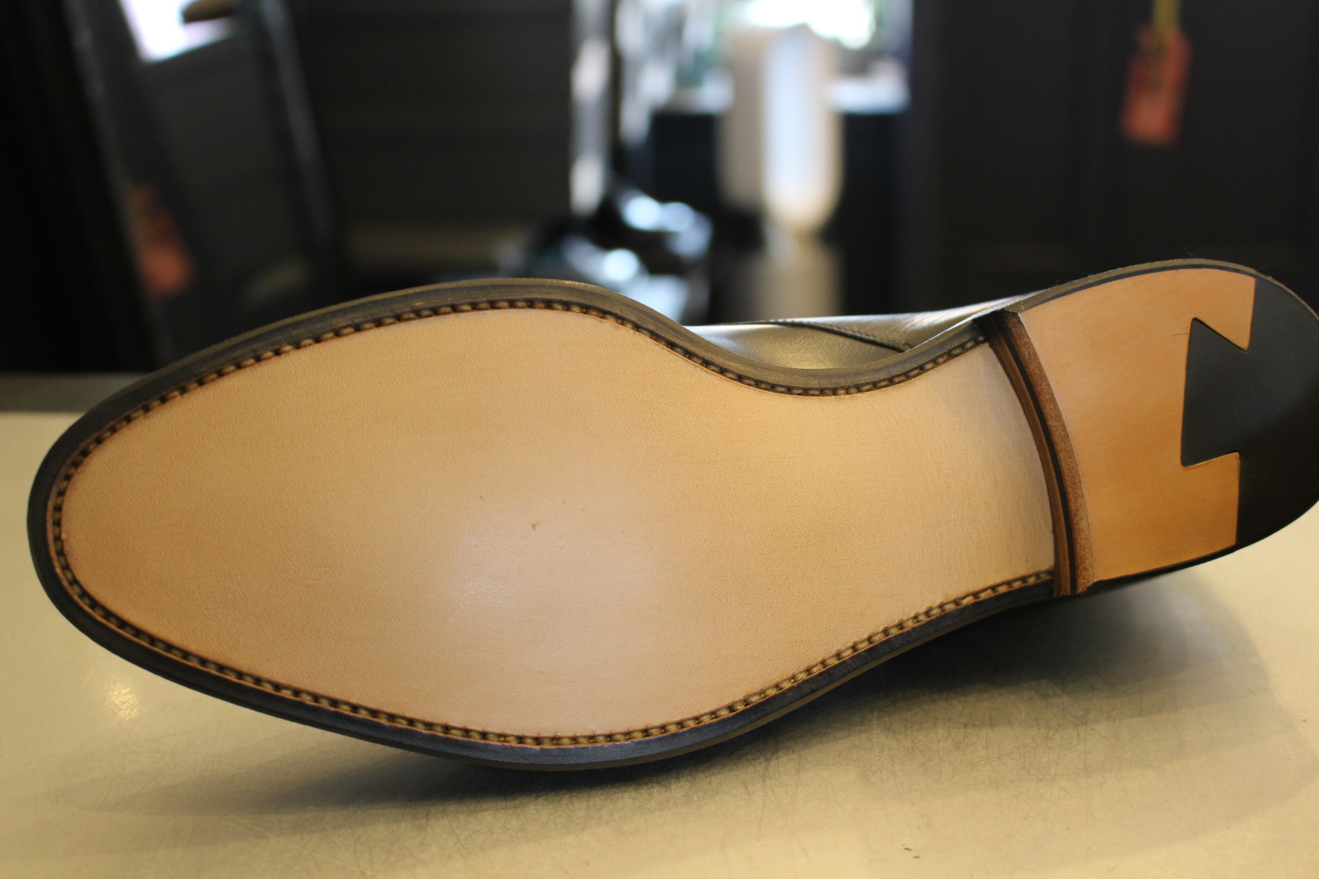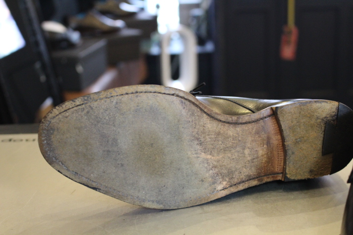 今回は既に穴が開いている為、オールソール(靴底交換)させて頂きました。