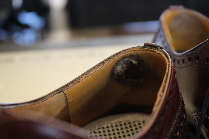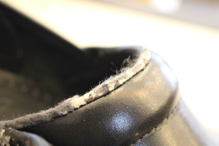 ビジネスシューズの修理で多い履き口の破れ・・・ 歩行時の擦れや靴のサイズが合っていない等の原因が考えられます。 既に1度修理されておりましたが、穴が大...
